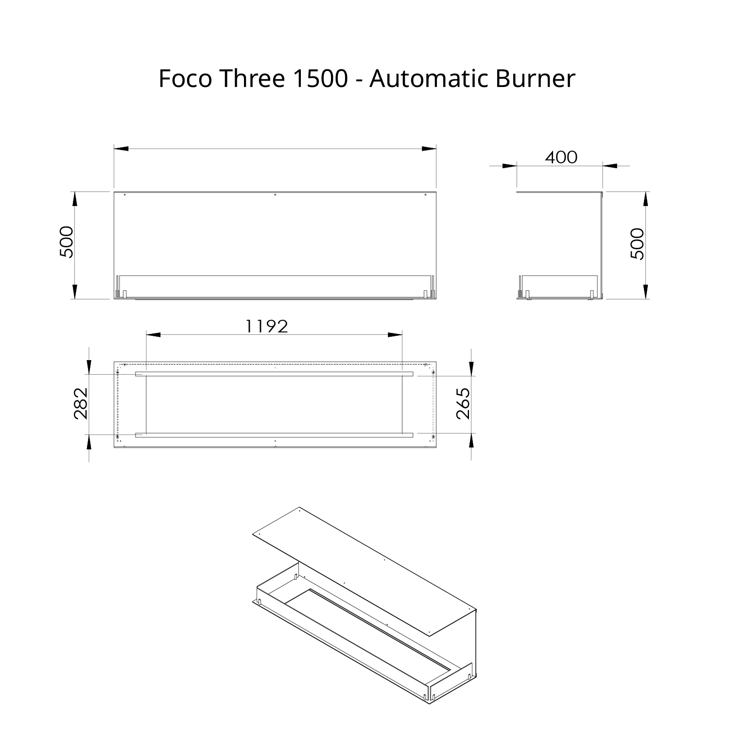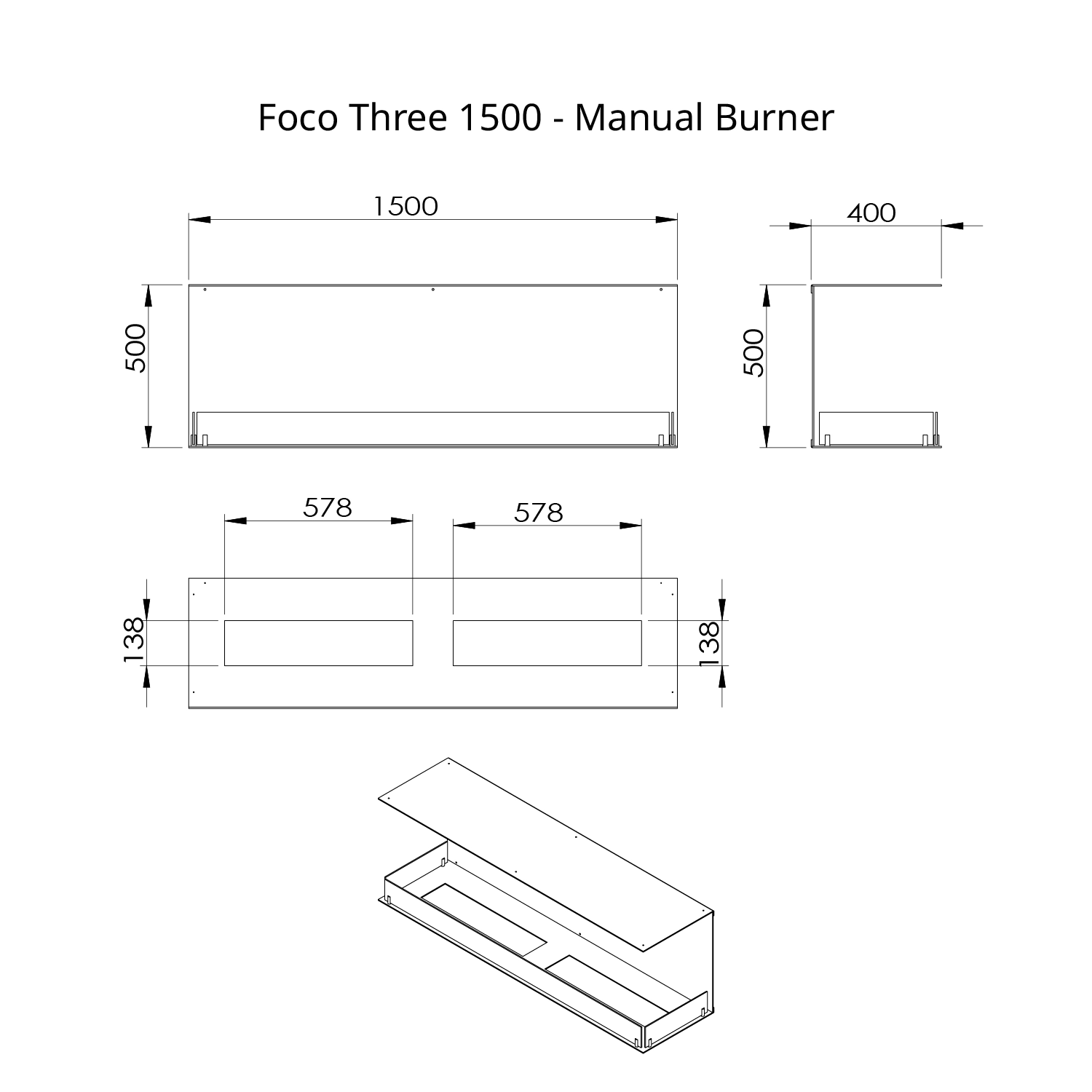 Foco Three 1500 is een ingebouwde bio-ethanolhaard van 150 cm breed, met zicht op het vuur van drie kanten – ideaal voor gebruik in een mediameubel of tv-wand met bio-ethanolhaard. Standaard wordt de Foco Three 1500 geleverd met twee manuele branders, maar je kan upgraden naar verschillende automatische modellen met afstandsbediening. De haard is vervaardigd uit 4 mm dik zwart gepoederlakt roestvrij staal en is aan de voorzijde en zijkanten voorzien van gehard glas, dat de vlammen beschermt en zorgt voor een veilige vuurervaring.