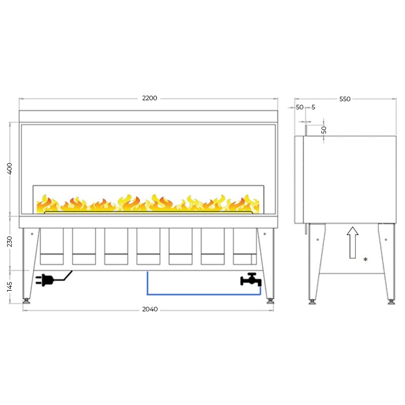 Incanto ST 2000 is een waterdamp tunnelhaard. De realistische vlammen worden gecreëerd door waterdamp en LED-verlichting en kunnen worden bewonderd vanuit 2 kamers.