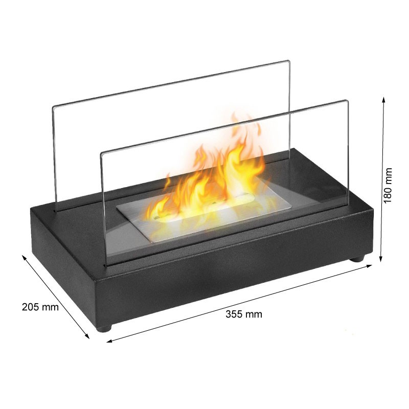 Kleine zwarte tafelmodel biohaard in een vierkant design met twee glasplaten. Brandtijd 2,5 uur.