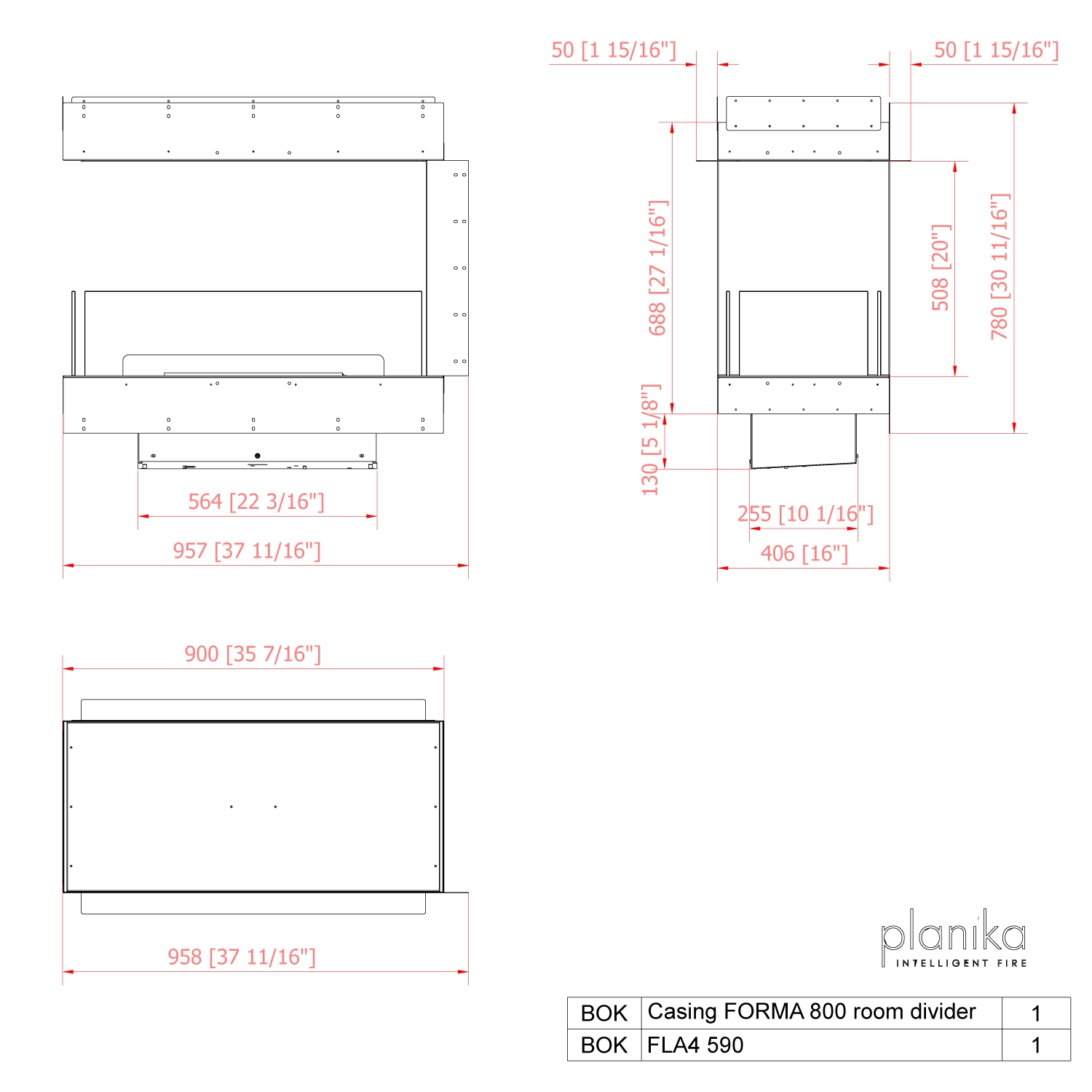 Planika Forma 800 Room Divider is een ingebouwde bio-ethanolhaard. De vlammen zijn vanuit een hoek van 180 graden te zien. Een kamergrootte van 31 m³ wordt aanbevolen.